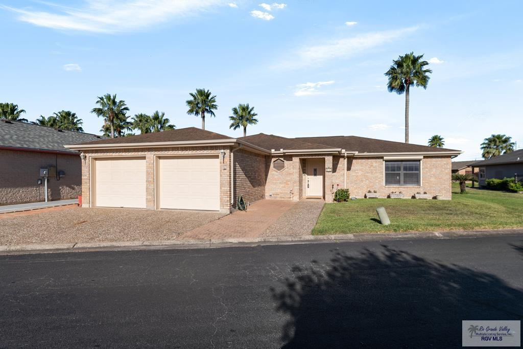 This beautiful 1,910 sq. ft. brick home sits on 1.5 lots and features a spacious living area, formal dining, and an updated kitchen with new quartz countertops, dishwasher, and microwave. Ceramic flooring runs throughout, with fresh interior paint, new ceiling, and updated faucets. The home offers two large bedrooms, including a master suite with double sinks, a garden tub, a walk-in shower, and a large closet with floor-to-ceiling storage. A temperature-controlled sunroom overlooks the patio and resaca. Additional features include an office cubby, a large utility room with a deep sink and ample storage, a freshly painted two-car garage with a work area, and hurricane shutters. The community offers a clubhouse, game/meeting room, three pools (one with a spa), tennis and pickleball courts, shuffleboard, bocce ball, a chipping and putting range, a dog park, and on-site vehicle storage for rent. Low monthly dues and year-round activities make this a perfect place to call home.