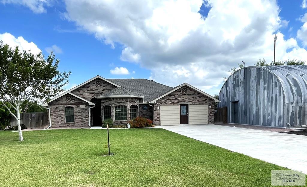 Nicely maintained custom 3 bed/2 bath 2,291sf home on corner lot in outer Los Fresnos. Many custom finishes like artistic stone work in flooring and kitchen area. Nice finished wood cabinetry throughout, large walk-in shower, double vanity in primary suite, gas range, water purification system, office/bonus room with wet bar, air purifier system, security surveillance system, large back yard with hot tub on paver patio, sprinkler system, underground gutter drainage system, fruit trees, lots of storage including 8'x40' shipping container, 35x40 Quanset Bldg with electricity/AC, perfect for workshop or storing lots of big toys! New Roof installed 2023, wind certified. Clean-outs for RV. Full amenities list available.