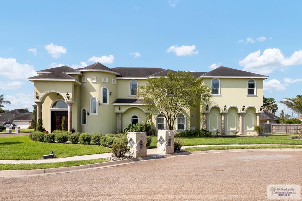 Tucked within the quiet cul-de-sac of Cornerstone Meadow Estates, this elegant custom home blends timeless design with relaxed sophistication. Featuring 4 bedrooms, 4 baths, and over 4,600 sq ft, every space is crafted for comfort and connection. Soaring ceilings, graceful moldings, and abundant natural light frame formal and casual living areas. The chef's kitchen offers rich cabinetry, granite counters, and views of the resort-style backyard. The main level hosts a serene primary suite with spa bath and walk-in closet, plus a private guest suite. Upstairs, two bedrooms and a versatile media room create perfect flexibility for family or guests. Outdoors, lush landscaping surrounds a sparkling pool, covered patio, and charming gazebo—an entertainer's dream. A refined home where elegance meets everyday ease in one of Weslaco's most desirable neighborhoods.