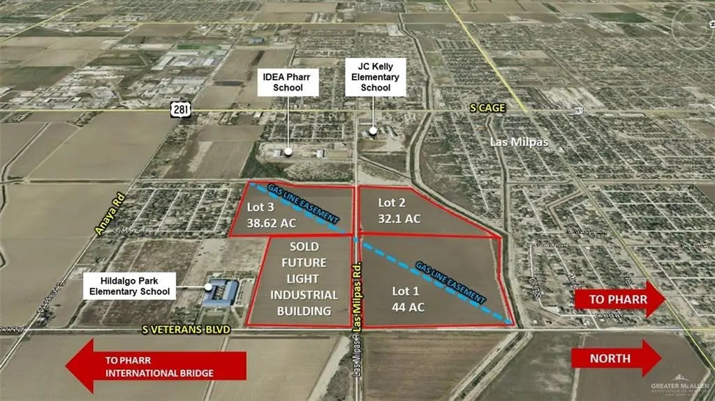 Potential for a variety of uses, this property in the Las Milpas area of South Pharr is in agricultural use currently. Utilities are not right to the property, but in the near to site area (see attached utility map provided from City of Pharr). A gas line does runs diagonally through this property, which will have to be planned around. Surrounding tracts also for sale by same owner, which could allow for a master planned/multi-phased project. The property directly to the east that has frontage on S. Veterans was recently sold and rezoned to light industrial use....this property may have an opportunity to be rezoned to light industrial use as well, but buyer would need to take it through the rezoning process.
