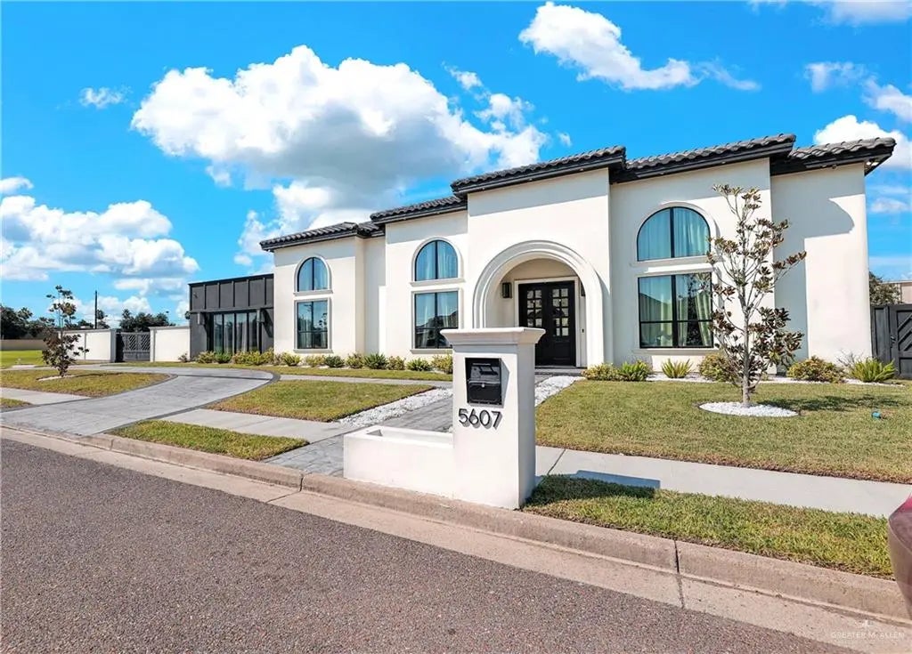 Located in the heart of McAllen, within the exclusive Nuevo Santander subdivision, this luxurious 5-bedroom residence boasts 5 full baths, 2 half baths, and 5,407 square feet of living space. Just a few blocks from Dove Ave. and 10th Street, this home offers both convenience and sophistication. Step into the oversized kitchen, designed for the modern chef, with high-end appliances, a massive island, and granite countertops that extend throughout the home.The open layout features soaring ceilings, adding to the grandeur of every room. The master suite is a private retreat, complete with double vanities, a rain shower, and a relaxing soaking tub. For entertainment, enjoy the state-of-the-art theater room with a wet bar. The office has an eclectic flair, perfect for creativity, while the personal gym caters to your fitness needs. Outside, a sparkling pool awaits alongside a fully equipped outdoor kitchen, making it ideal for gatherings. Experience style, comfort, and functionality.