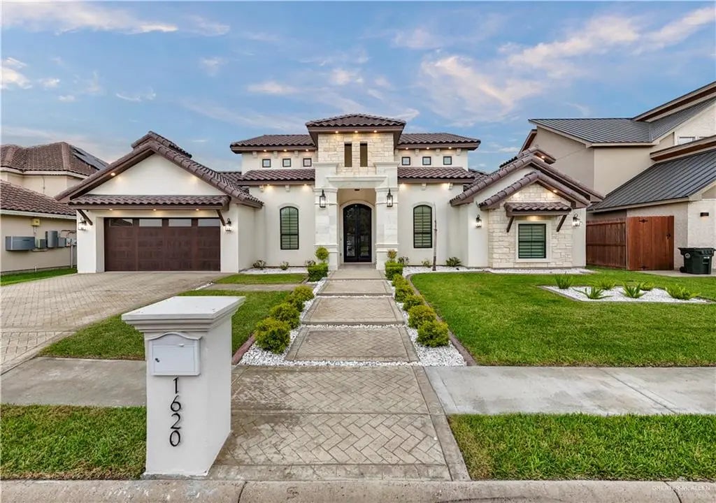 Stunning custom Mediterranean-style home on a 10,000+ sq ft lot in Sharyland ISD. Built with Hebel panel walls, foam insulation, and a concrete tile roof for lasting quality and energy efficiency. A grand 10-ft wrought iron door opens to an elegant interior featuring porcelain tile throughout, cantera columns, and limestone accents. The spacious primary suite offers a spa-inspired bath with upscale finishes. Additional rooms provide flexible living and entertaining options, including a rear bonus room with its own half bath—perfect for a media room, game room, or guest space. The covered patio is prepped with connections for an outdoor kitchen. A full sprinkler system and low-maintenance stucco exterior complete the home. Located in an HOA-managed community, this lightly lived-in residence presents a rare opportunity for newer construction in a highly desirable, established area. Conveniently located near schools, shopping, and dining with easy access to major roads.