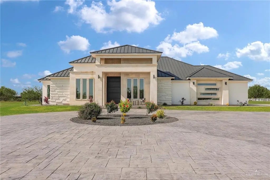 This extraordinary custom home sits on over 5 acres and blends elegance with functionality. Featuring soaring 10–12 ft. ceilings and designer touches throughout, the home welcomes you with a grand 9.5 ft. solid metal front door and over 1,000 sq. ft. of Cantera stone on the exterior. Enjoy year-round comfort with a foam-insulated metal roof, central A/C in the oversized 4 car garage, and a tankless gas water heater. Inside, you'll find LG appliances, a large quartz island, wet bar, and an expansive pantry. Three fireplaces (wood, electric, and gas) add warmth and ambiance to both indoor and outdoor spaces. The fully finished exterior barn includes a full bathroom, washer and dryer, double front and rear doors, a covered patio, and surrounding concrete—ideal as a guest suite, office, or workshop. The property also features stables for horses and cattle, a stamped 6" concrete driveway, and an electric motorized gate. A rare blend of luxury, privacy, and country versatility.