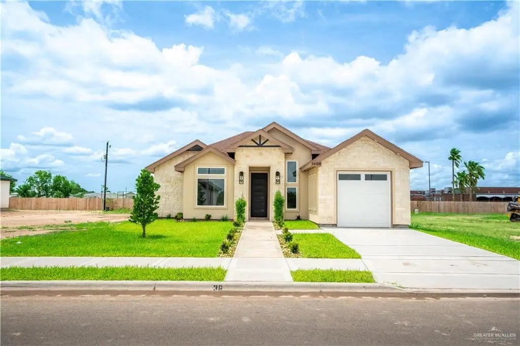 Discover modern elegance in this beautifully designed 3 bedroom, 2.5 bathroom New Construction. The split floor plan offers privacy and comfort, with porcelain tile flooring, and LED lighting throughout. The open-concept kitchen is a dream, boasting sleek white cabinets, an elegant backsplash, trendy fixtures, and top-grade granite countertops for beauty and durability. A bonus room is perfect for an office, study, or play area. High decorative ceilings with modern wooden beams creates an inviting atmosphere. The spacious primary suite features a luxurious ensuite with double vanities, a walk-in shower, and ample closet space, while well-sized secondary bedrooms share a stylish bath. The stone and stucco exterior, paired with professional landscaping, ensures curb appeal, and a covered patio extends the living space outdoors—ideal for relaxing or entertaining. With exceptional premium finishes, an energy-efficient design, this modern masterpiece is a must-see. Schedule a private tour!