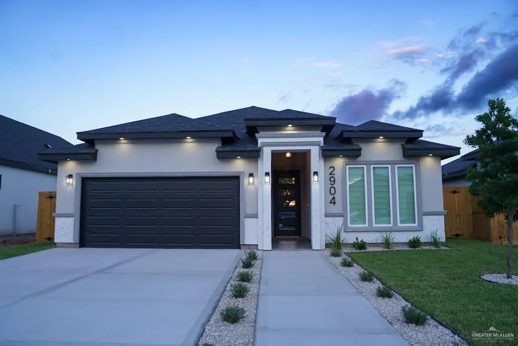 Stunning new construction featuring 4 bedrooms and 2.5 bathrooms in a modern open-concept design. The living area offers high ceilings, custom recessed details, and an electric fireplace with built-in shelving. The kitchen is complete with quartz countertops, custom cabinetry, and contemporary fixtures. The primary suite includes a dual vanity with a lighted mirror and a frameless glass walk-in shower. Additional features include wood-look tile flooring throughout, designer lighting, and a two-car garage. Exterior highlights showcase clean landscaping, modern curb appeal, and a spacious driveway.