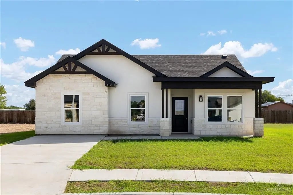 Stunning 3-bedroom, 2-bath new construction home sitting on a 8,398 sqft lot showcasing modern design and quality finishes throughout. Step into an open-concept floor plan with high decorative ceilings, wood-look tile flooring, and elegant exposed beams. The living area features a sleek black accent wall with an electric fireplace, creating a perfect focal point. The kitchen offers custom cabinetry, quartz countertops, and a spacious island with pendant lighting. The primary suite includes a large walk-in closet, double vanity, and a beautiful tiled shower. Enjoy a huge backyard and a convenient location near E Sioux Rd and N Raul Longoria Rd, close to schools, shopping, and dining.