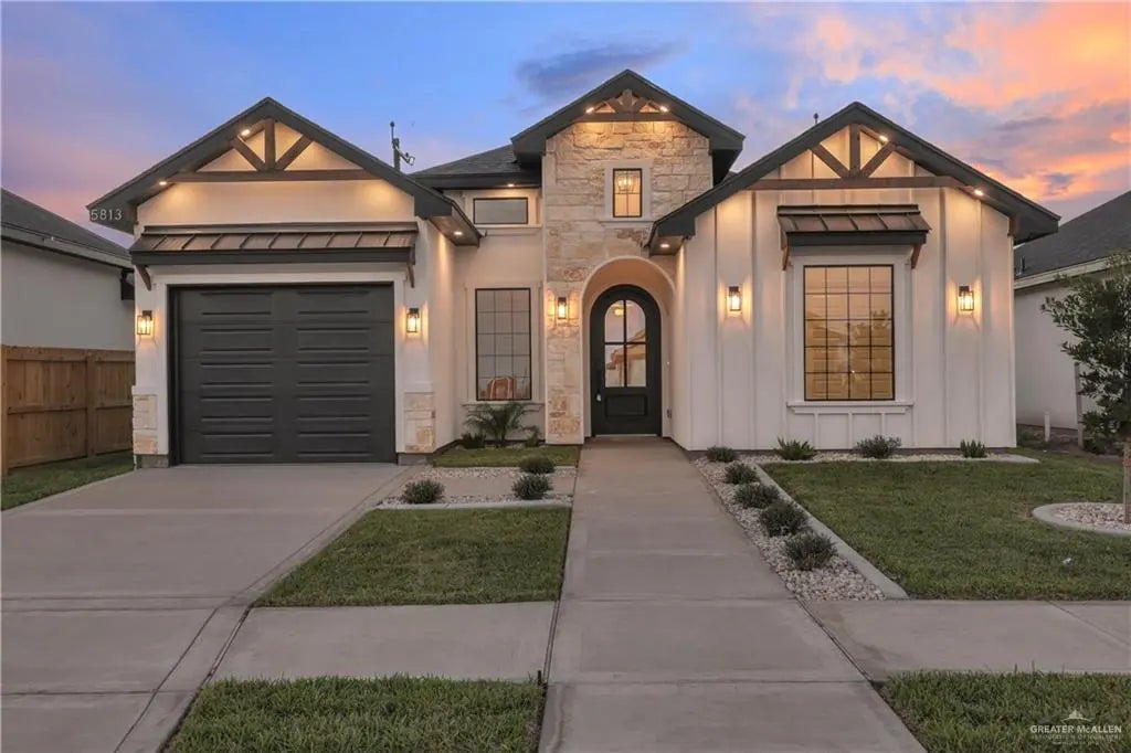 Beautiful New Construction in Sol Alegre Subdivision – Phase II This stunning new home in Edinburg features 3 bedrooms, 2.5 bathrooms, a one-car garage, and a functional floor plan designed for comfort and style. The interior offers an open layout with an indoor laundry room and a dedicated mudroom area for added convenience. The kitchen showcases warm tones, custom finishes, and modern design, flowing seamlessly into the living area where an electric fireplace with a stone accent wall creates a cozy focal point. Elegant gold fixtures throughout the home add a touch of sophistication and elevate the overall look. The living space is further enhanced by beautiful wood ceiling beams that bring character and charm. Step outside to a covered patio and spacious backyard, perfect for BBQs, entertaining, or relaxing outdoors. Located in the growing Sol Alegre Subdivision in Edinburg, this home blends style, function, and thoughtful design—ready to welcome its new owner!