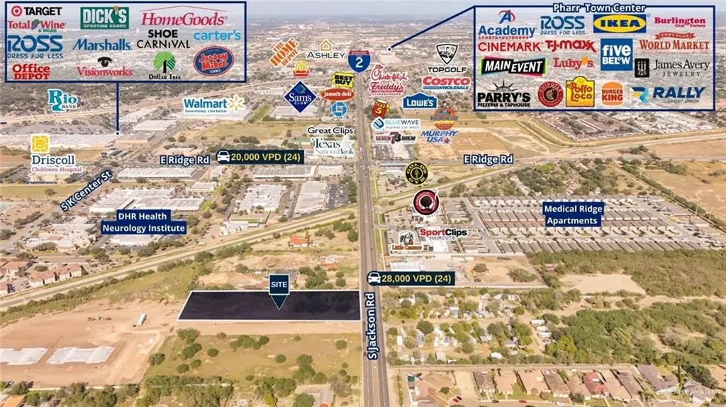 This commercial land site is strategically located along S. Jackson Rd, offering outstanding visibility and exposure to 28,000+ vehicles per day. Positioned within a dense retail and medical trade area, the property benefits from immediate proximity to national retailers, daily-needs services, and major healthcare users. New apartment complexes currently under construction directly behind the site will further increase daytime and evening traffic, creating a strong built-in customer base. Ideal for retail, service, or drive-thru development in one of McAllen’s most active growth corridors.